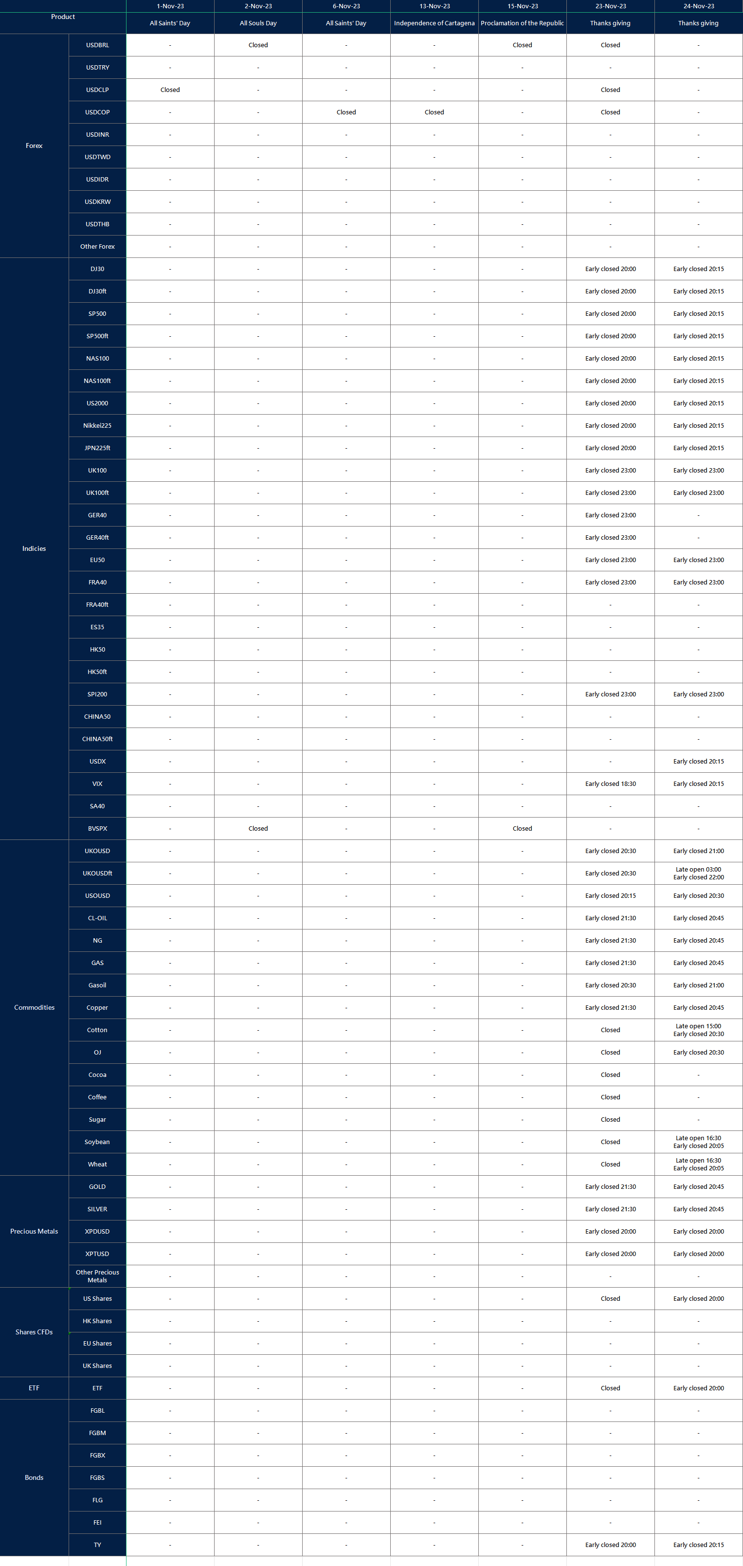 Please note that the following instruments’ trading hours will be affected by the upcoming holidays.