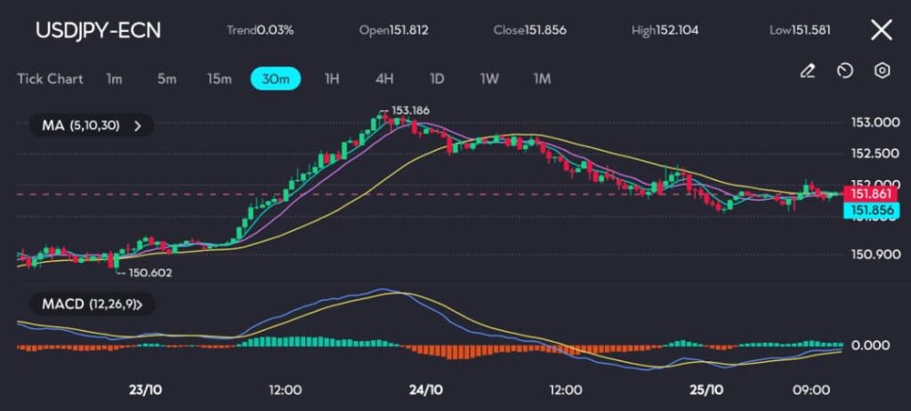 Picture: USDJPY has declined from a peak of 153.186 to 151.856, with momentum weakening on the VT Markets app.