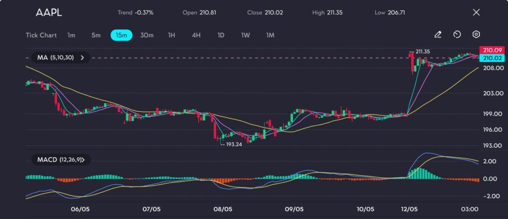Picture: AAPL rebounds from $193 low, rallies to $211 peak with momentum cooling, as seen on the VT Markets app