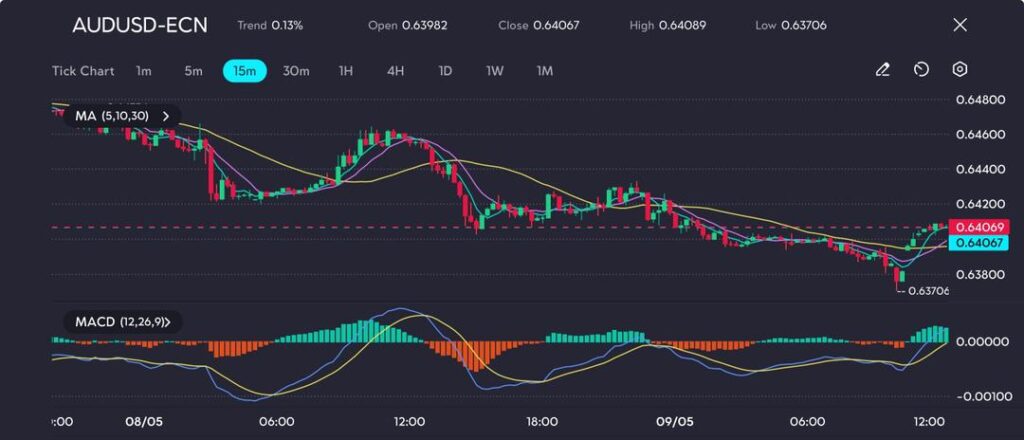 Picture: AUDUSD bounces from 0.6370 low with MACD turning bullish, but 0.6420 remains key near-term hurdle, seen on the VT Markets app
