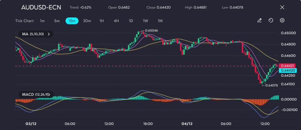 Despite an early push higher, the currency was unable to sustain its gains, falling back to its session low of 0.6408, which suggests a lack of conviction in the bullish sentiment.