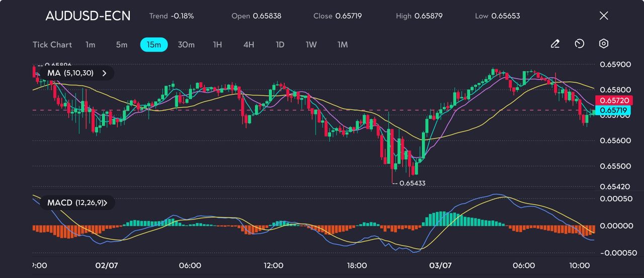 The AUD/USD pair is exhibiting a choppy short-term structure, with intraday support forming at 0.65433 and resistance capping near 0.65880. After rebounding strongly from the session low, the pair climbed above the 30-period moving average and peaked around 0.65879. However, recent candles suggest a pullback is underway, with prices now trading below short-term moving averages (5, 10), and MACD turning bearish once again.