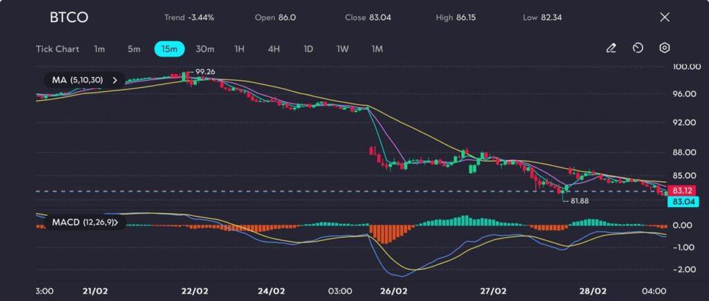 Picture: BTCO struggles near $83.04 after extended bearish momentum, as seen on the VT Markets app