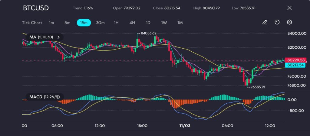 Picture: BTCUSD strengthens to 80,213.54, testing key resistance at 80,450.79 amid bullish recovery, as seen on the VT Markets app.