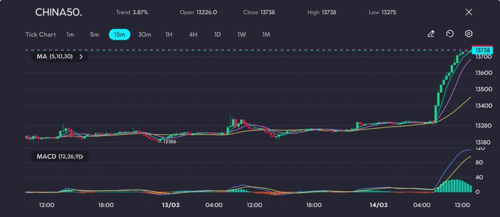 Picture: China50 soars past 13,700 as bulls drive a breakout rally, as seen on the VT Markets app