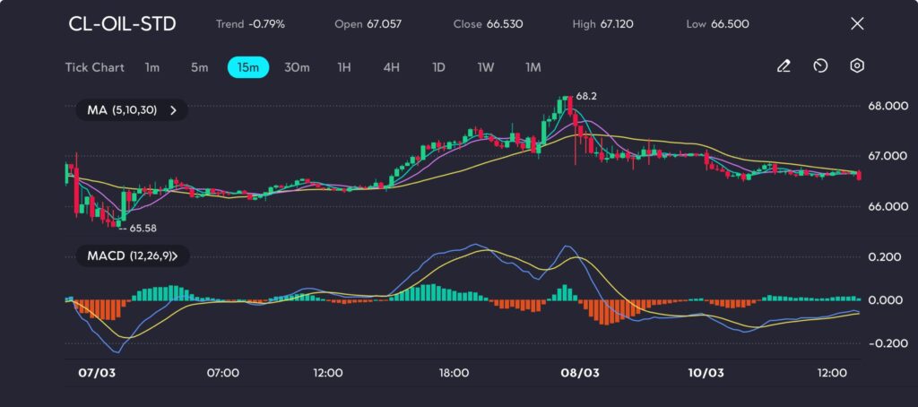 WTI Crude Oil (CL-OIL) declined by 0.79%, opening at $67.057 and closing at $66.395. Prices saw volatility, touching a high of $68.120 and dipping to a low of $66.500, indicating increased bearish pressure.