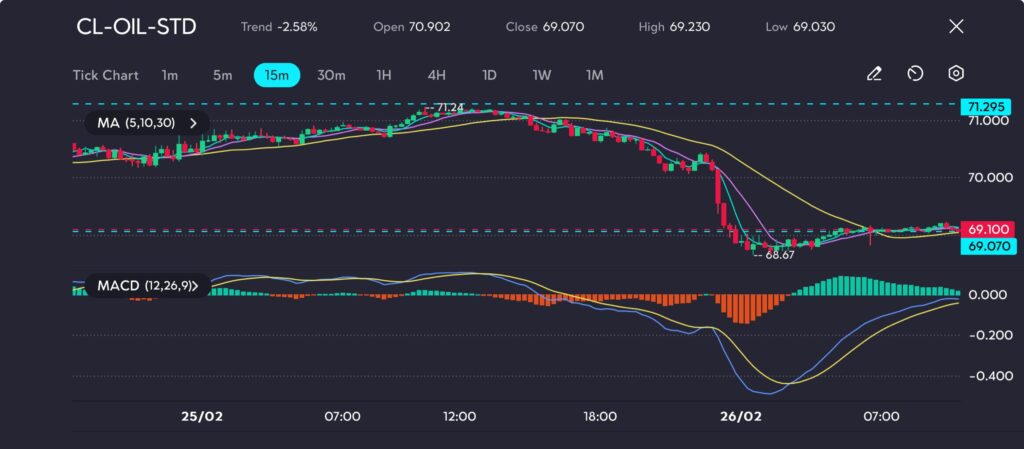 CL-OIL (Crude oil/WTI) dropped 2.58%, closing at $69.070 after opening at $70.902. The session saw a sharp decline, hitting a low of $69.030, while resistance was tested near $71.24 before the reversal.