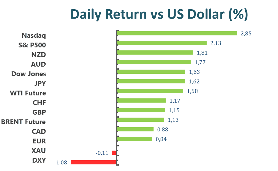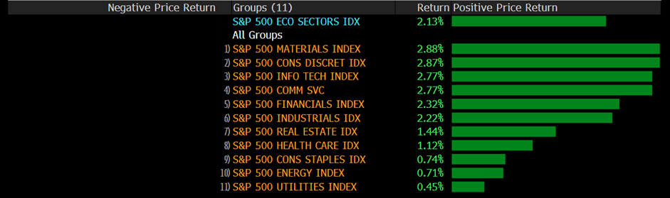 The benchmarks, S&P 500, Nasdaq 100, and Dow Jones Industrial Average surged on Wednesday as the critical US CPI indicated softer than expected results. All eleven sectors in S&P 500 stayed in positive territory and six out of eleven sectors rose more than 2% for the day, as Materials and Consumer Discretion performed the best among all groups, advancing with 2.88% and 2.87% respectively on Wednesday. The Dow Jones Industrial Average climbed 1.6%, Nasdaq 100 increased 2.8%, and the MSCI world index went up 1.8% on a daily basis for the day.