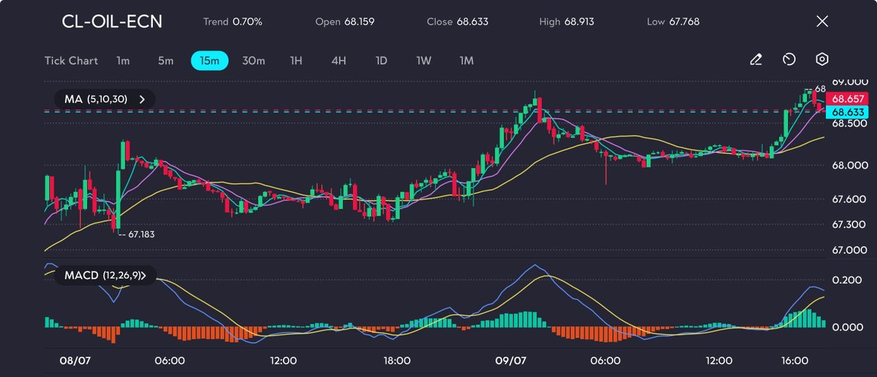 Oil prices have pulled back after reaching an intraday high near $68.90–$69.00, with the 5, 10, and 30‑period moving averages now converging around $68.60, signaling a potential short-term equilibrium.