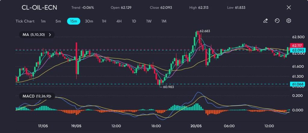 Crude oil is trading within a narrow consolidation range after rebounding off the support level at $60.983 and reaching a recent high of $62.683. The price action on the 15-minute chart has since flattened, with candles compressing just above the 30-period moving average. The short-term moving averages (5 and 10) are beginning to converge, indicating hesitation in directional momentum.