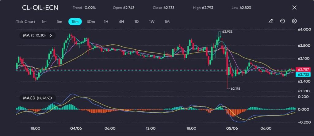 Picture: Oil rebounds off $62.18 low after sharp drop; recovery stalls below $63 with trend momentum still muted, as seen on the VT Markets app