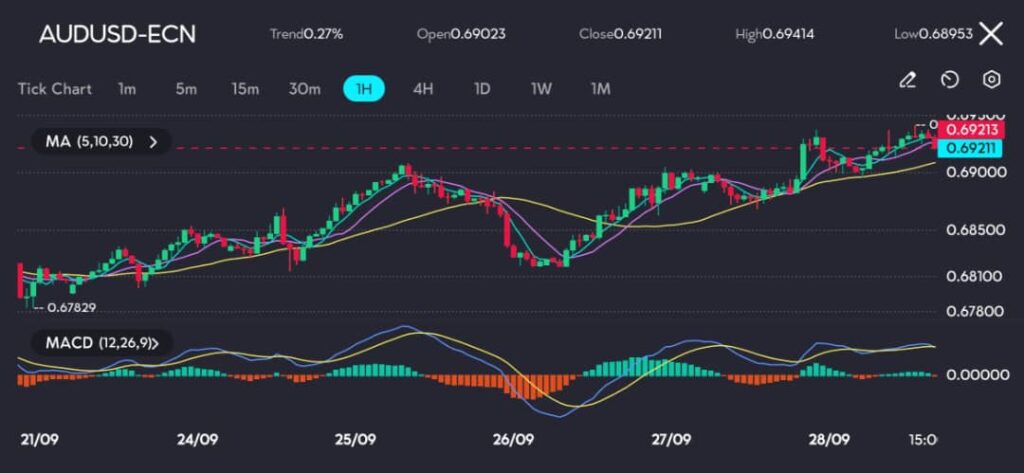 We look to the charts for guidance. The AUD/USD pair closed at 0.69211 after reaching an intraday high of 0.69414, reflecting continued upward momentum from the previous sessions. The pair has been gradually climbing, supported by a weaker U.S. dollar and increased risk appetite in global markets.
