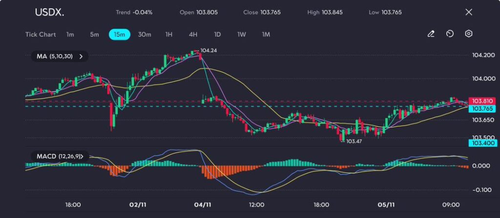 The index tested resistance around the 103.80 level, and the most recent high point was 104.24 before a drop towards 103.47. This pullback suggests a lack of strong buying momentum, with traders likely cautious about the next significant move.