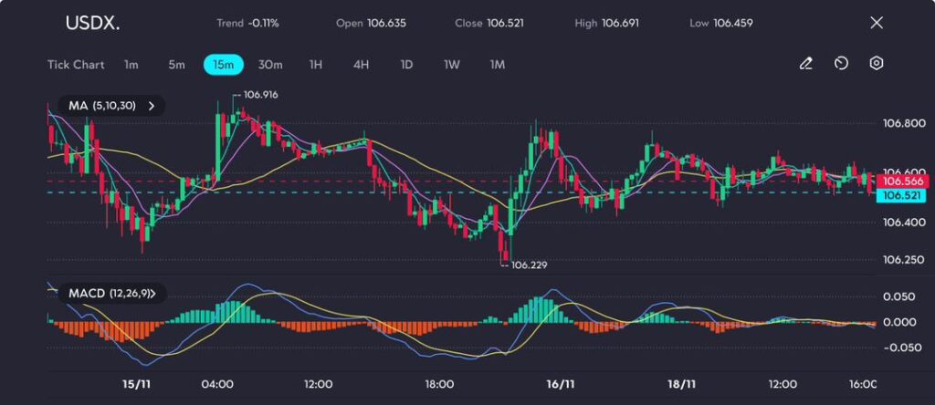 Picture: USDX steadies near 106.50 as mixed momentum keeps traders focused on central bank signals and key support levels, as seen on the VT Markets app.