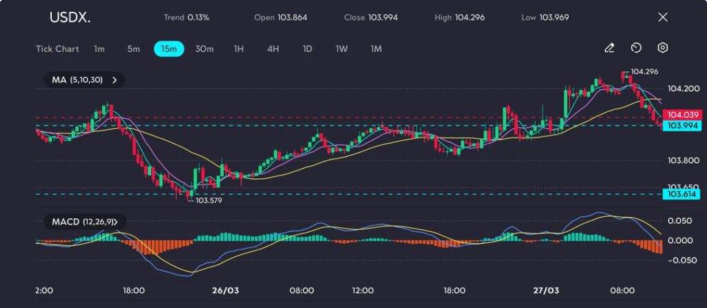 The USDX (US Dollar Index) chart on the 15-minute timeframe shows a steady uptrend that peaked around the 104.296 level before pulling back slightly. After a minor dip to the 103.579 support, price gradually climbed higher, supported by rising moving averages (MA 5,10,30), which indicate bullish momentum.