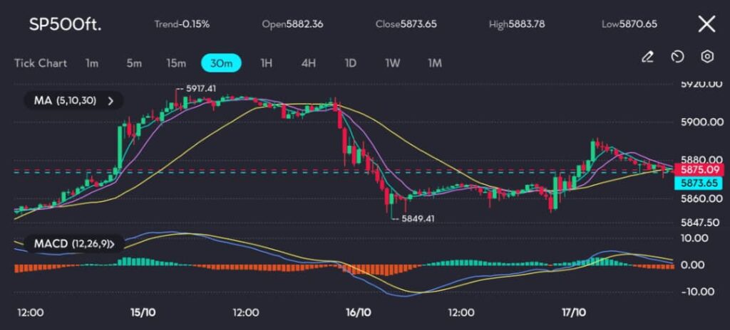 See: The SP500ft chart shows price stabilising near 5873.65 after recovery with moving averages and MACD signalling consolidation on the VT Markets app.