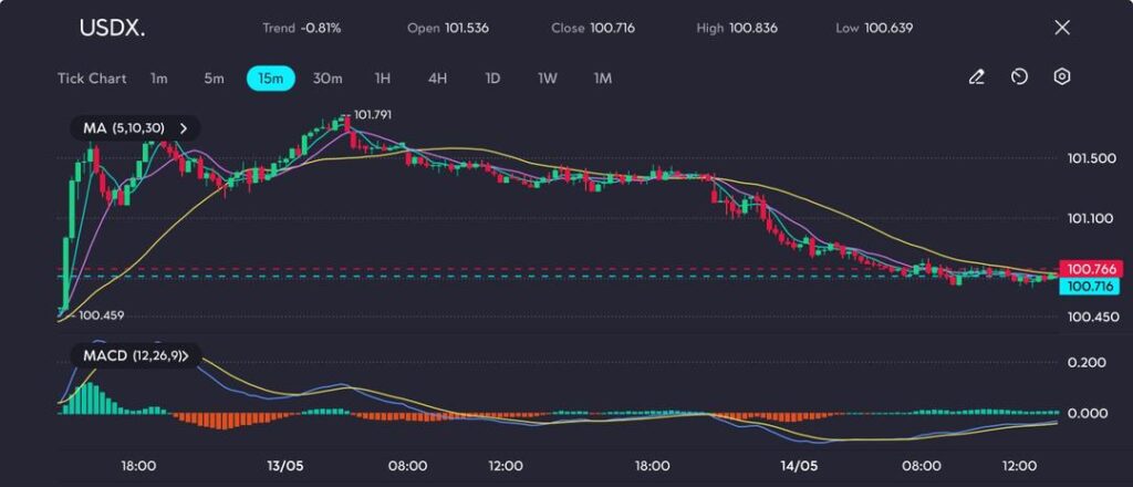 The US Dollar Index (USDX) broke above the 101.70 mark early on 13 May, but the rally was short-lived. After peaking at 101.79, the index began a consistent decline, slipping below the 10-, 20-, and 30-period moving averages and confirming a bearish crossover. This downtrend continued steadily into 14 May, with the price now hovering near 100.71, a level aligned with prior support at 100.45.