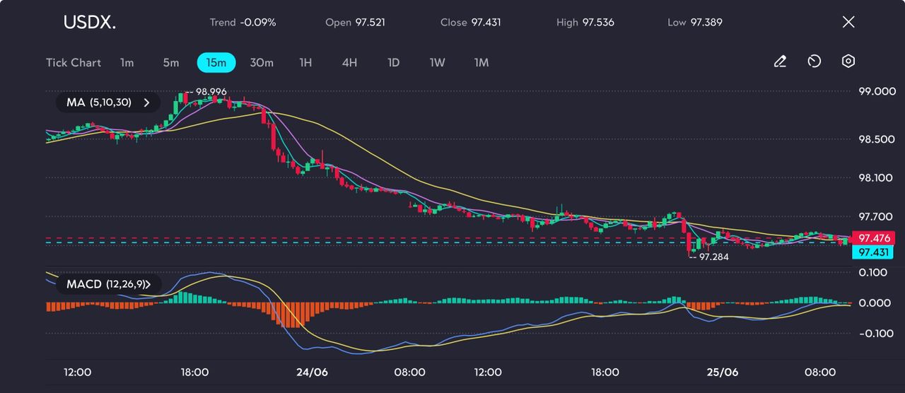Picture: Bearish momentum dominates as dollar hovers near 97.30 lows, as seen on the VT Markets app