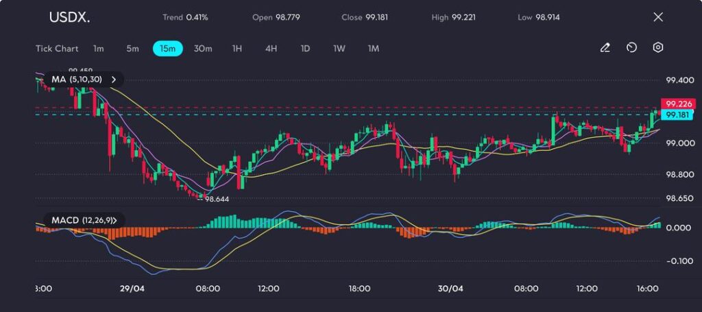 Picture: Dollar regains traction above 99.00 as bullish momentum firms, testing key resistance near 99.23, seen on the VT Markets app