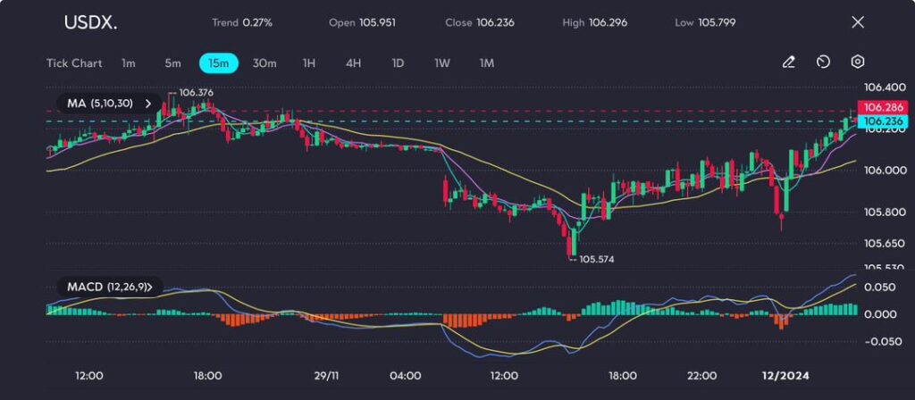Picture: The USDX closed at 106.236, with resistance at 106.30 and support near 105.80, as seen on the VT Markets app.