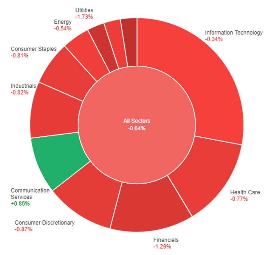 On Thursday, all sectors in the market experienced a general decline, with the overall market showing a decrease of 0.64%. The Communication Services sector was an exception, bucking the trend with a gain of 0.85%. However, the Information Technology sector saw a slight dip of 0.34%. The Energy sector also experienced a modest decline of 0.54%, while the Materials sector faced a drop of 0.67%. Health Care and Consumer Staples sectors both declined by 0.77% and 0.81%, respectively. The Industrials and Consumer Discretionary sectors had larger losses, both falling by 0.82% and 0.87%, respectively. The Financials sector showed the most significant decrease, experiencing a notable drop of 1.29%. The Utilities sector followed closely with a decline of 1.73%, and the Real Estate sector suffered the largest loss, plummeting by 2.12%.