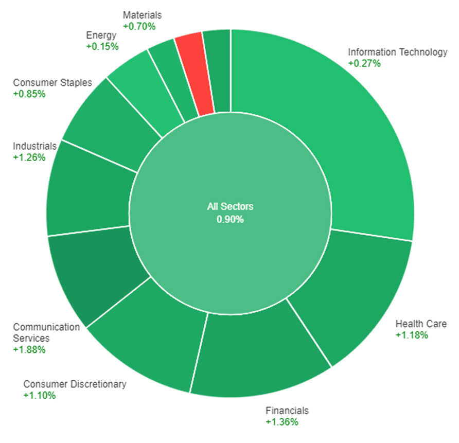 On Monday, across all sectors, the market showed a notable uptick of 0.90%. Particularly strong gains were observed in the Communication Services sector, which surged by 1.88%, followed closely by Financials with a rise of 1.36%, and Industrials, which advanced by 1.26%. Real Estate also exhibited a solid increase of 1.21%, while the Health Care sector saw a rise of 1.18%. Noteworthy gains were recorded in the Consumer Discretionary sector, which climbed by 1.10%, and the Consumer Staples sector, which experienced a respectable growth of 0.85%. Materials exhibited a modest uptrend of 0.70%. However, the Information Technology sector displayed a more subdued increase of 0.27%, and the Energy sector had a marginal rise of 0.15%. In contrast, the Utilities sector showed a slight decline of -0.02% during the same trading period.