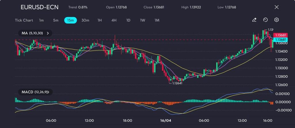 EURUSD has staged a strong intraday reversal, rebounding sharply from the 1.12641 low early on April 16 and climbing steadily into 1.13681 by session close. The move is backed by a clean bullish alignment across the 5, 10, and 30-period moving averages, with the 5MA crossing above the 30MA around the 1.13000 level—marking the shift in short-term sentiment.