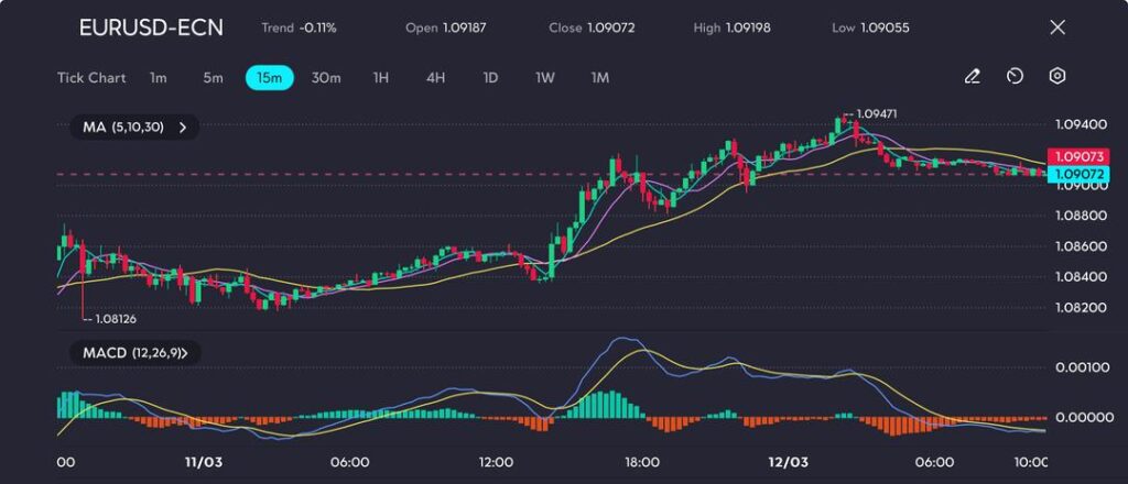 The EUR/USD pair is down 0.11%, with price action showing a slight pullback after reaching a high of 1.09471. The session saw a low of 1.09055, and the pair is currently trading near 1.09072, consolidating after an earlier rally. The moving averages (5, 10, 30) suggest a pause in momentum, while the MACD is flattening, indicating potential consolidation before the next move.