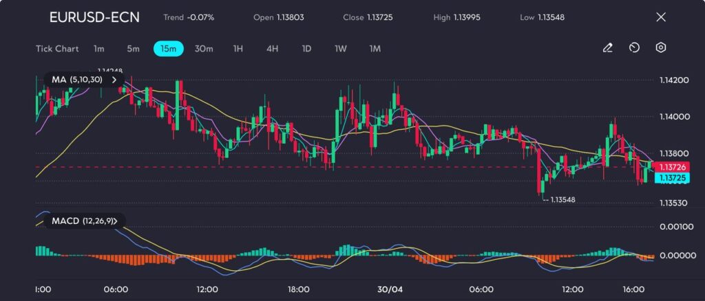 The EUR/USD pair is trading near 1.13725, showing signs of consolidation after testing both support at 1.13548 and intraday resistance at 1.13995. The moving averages (5, 10, 30) remain tightly bunched, reflecting indecision and a lack of dominant trend in the short term. Price remains bound within a narrow range, hinting at market caution.