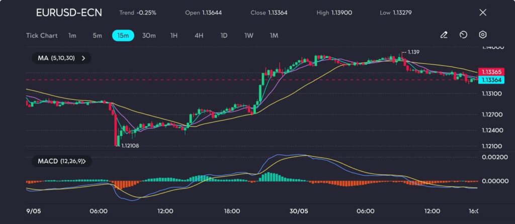 Picture: EURUSD eases from 1.139 peak, stalls near 1.133 as bullish momentum fades and consolidation sets in, as seen on the VT Markets app