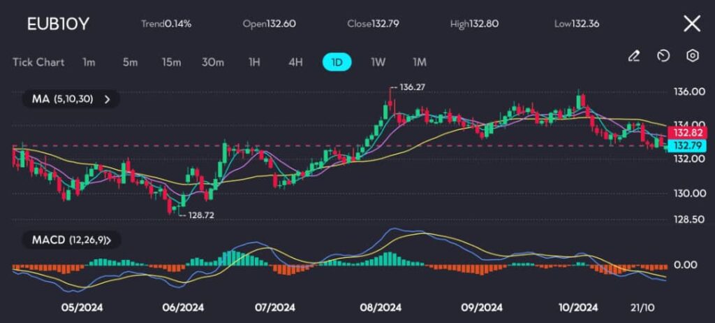 See: The EU 10-year bond yield shows a slight downward trend at 132.79, with bearish momentum indicated by the MACD on the VT Markets app.