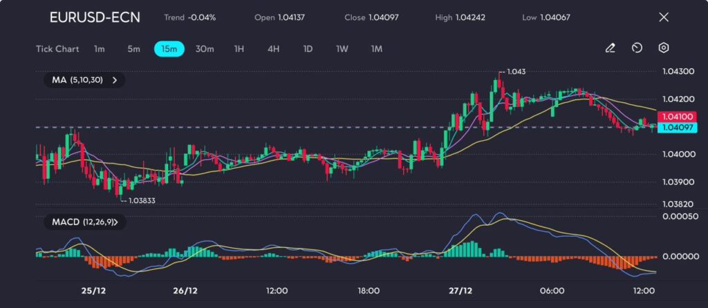 Picture: EURUSD consolidates near 1.041, facing resistance at 1.043 as momentum weakens, as seen on the VT Markets app.