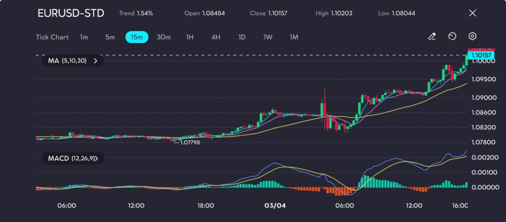 EURUSD increased by 1.54%, closing at 1.10157 after opening at 1.08484. The session saw a sharp upward movement, reaching a high of 1.10203 before retracing slightly to close near 1.10157.