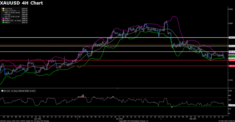 Gold price dropped towards $1,820 on Wednesday as the US Dollar maintained its hawkish bias. At the time of writing, Gold price is trading at $1824.61, posting a 0.56% loss daily, while the US Dollar Index rose 0.37% to 104.558. The US Dollar advance following the Federal Open Market Committee (FOMC) Meeting Minutes. The document showed that a few participants favored a 50 basis point (bps) rate hike, while some believed there was an elevated risk of a recession in 2023. Most importantly, all participants agreed more rate hikes are needed to achieve the inflation target, which benefits the US Dollar, weighing on dollar-denominated Gold.
