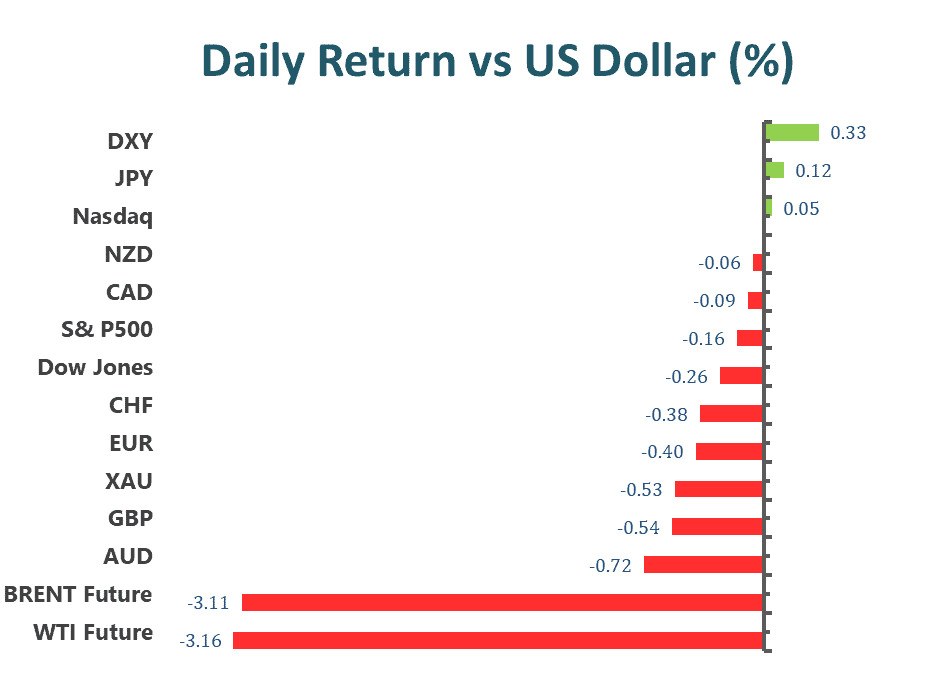 Gold suffered from daily losses with a 0.53% loss for the day after sliding towards the $1824 area and surrendered most of its early gains during the US trading session, as the geopolitical fears and hawkish Federal Reserve Minutes both exerted bearish pressure on the Gold price. Meanwhile, WTI Oil declined sharply with a 3.16% loss for the day.