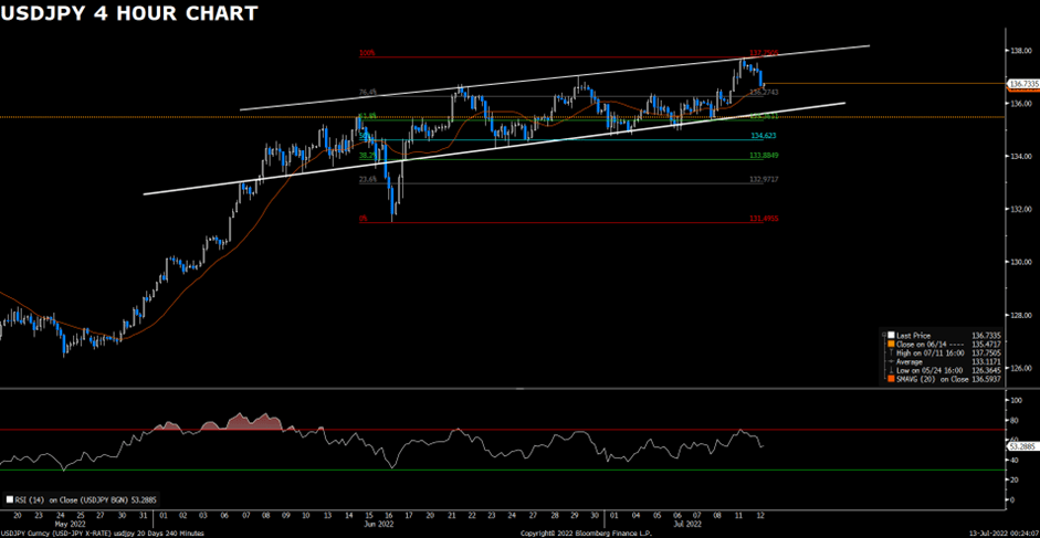 USDJPY heads into the correction phase after reaching a 24-year peak. The corrective pullback seems to be some profiting taking ahead of the US CPI on Wednesday. Technical speaking, USDJPY witnesses some profiting- taking after hitting the upper bound of the bullish channel as well as the immediate resistance of 137.75. However, the outlook of USDJPY remains bullish as it continues to trade within the ascending channel and above the 20 Simple Moving Average. As long as USDJPY stays above the 135.00 mark, the upside momentum is expected to remain unchanged. On the flip side, failure to hold above 135.00 would erode its bullish outlook on the four-hour chart. Further price action eye on the US CPI report.