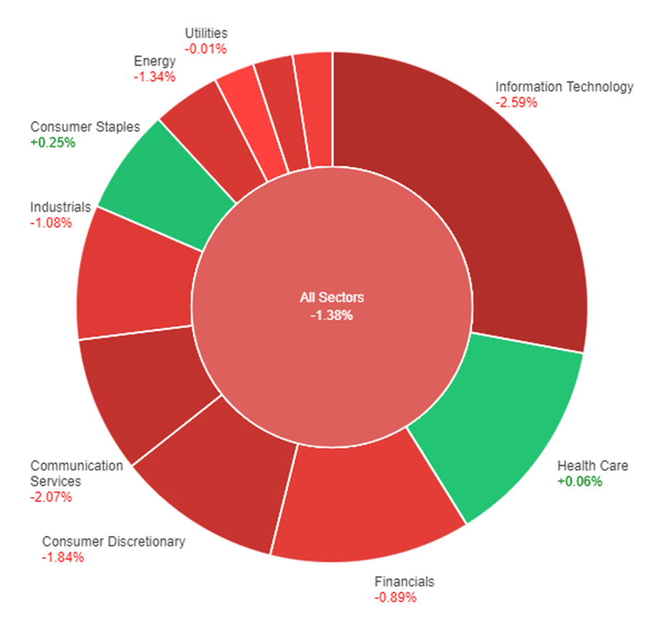 On Wednesday, the overall stock market experienced a decline of 1.38%. Among the sectors, Consumer Staples showed a slight increase of 0.25%, while Health Care gained 0.06%. On the other hand, the Communication Services sector suffered the most significant drop of 2.07%, closely followed by Information Technology, which declined by 2.59%. Other sectors that experienced losses were Energy (-1.34%), Materials (-1.23%), Consumer Discretionary (-1.84%), Industrials (-1.08%), Financials (-0.89%), Real Estate (-0.44%), and Utilities (-0.01%).