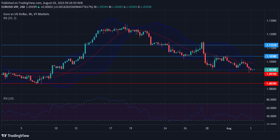 The EUR/USD pair experienced a significant drop below key support levels, reaching 1.0919, the lowest since July 7, due to the US dollar’s robust performance and risk aversion triggered by Fitch’s downgrade of the US sovereign rating. Despite initial gains after the announcement, the pair resumed its downward trend as the US dollar strengthened, breaking below 1.0960. The US Dollar Index rose to a four-week high above 102.50 following positive labor market data, with private employment increasing by 324K according to ADP. More US employment data is expected, making it crucial for market sentiment. On the horizon, Germany’s trade balance data, service PMIs, Eurostat’s Producer Price Index, and the Bank of England’s decision will be critical for the Euro’s performance.