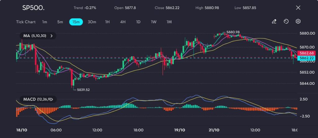 The SP500 chart closed at 5862.22, reflecting a drop of 0.27% for the session. The price reached a high of 5880.98 before pulling back, and the low of the day was 5857.85.
