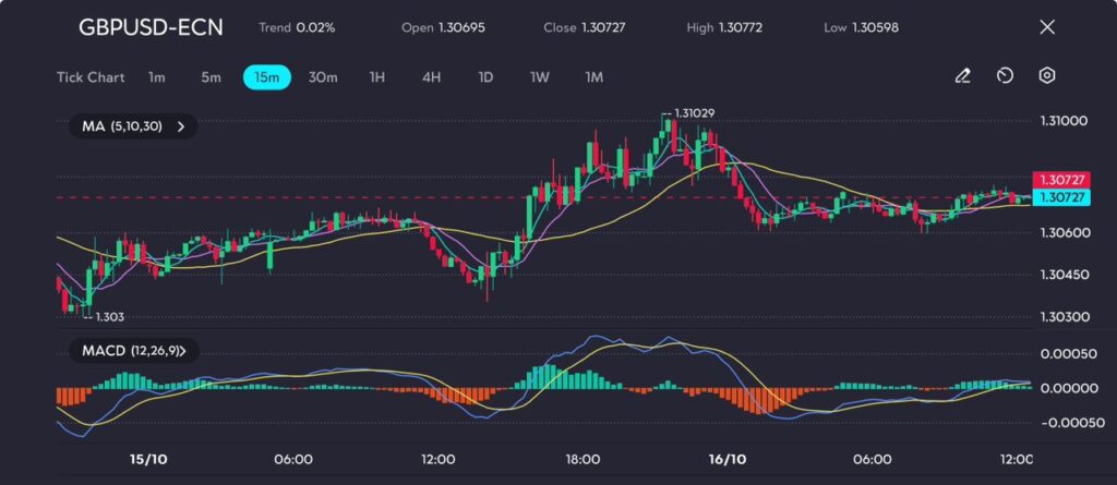 Picture: GBP/USD consolidates at 1.30727 as seen on the VT Markets app.