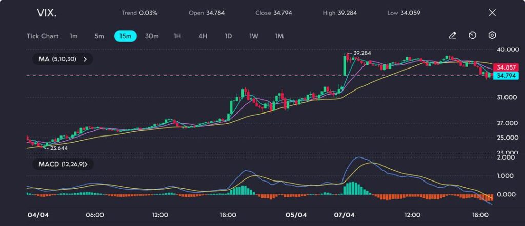 The benchmark VIX index climbed to 39.284 before settling around 34.794, pushing into crisis-level volatility not seen since August. On the 15-minute chart, the volatility index has broken clear of any near-term resistance, rising from a low of 23.644 in just 48 hours—an abrupt signal that traders are fleeing risk across all asset classes.