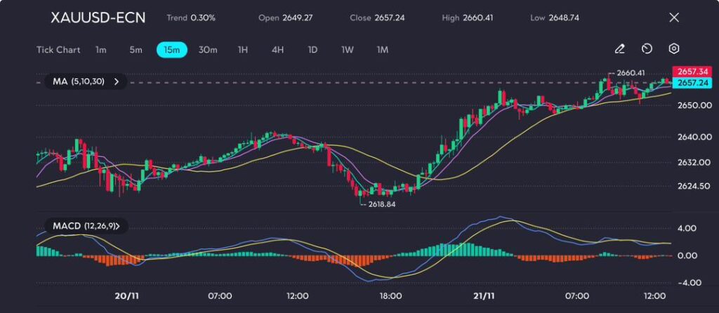 Picture: Gold climbs to $2,657.24, hitting a two-week high as safe-haven demand strengthens, as seen on the VT Markets app.