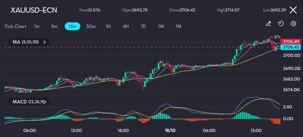 See: Gold is showing a bullish trend with upward momentum but it faces short-term resistance around 2714 on the VT Markets app.