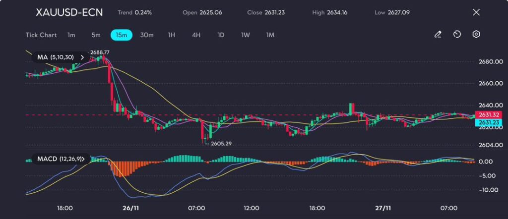 Picture: Gold prices stabilise at $2,631 after recovering from intraday lows, as seen on the VT Markets app.