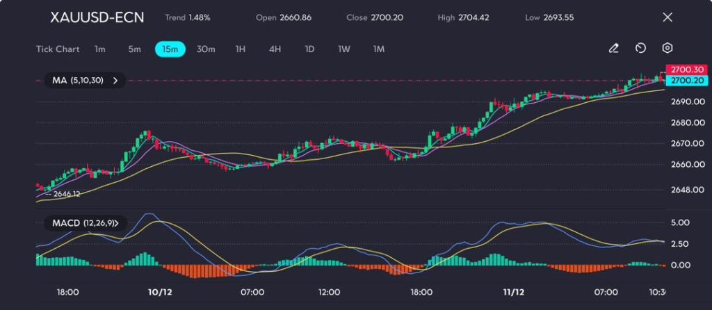 The charts indicate the steady movement of gold over the last trading session, closing around 2700.20 and moving upward, displaying a steady climb from its opening near 2660.86.