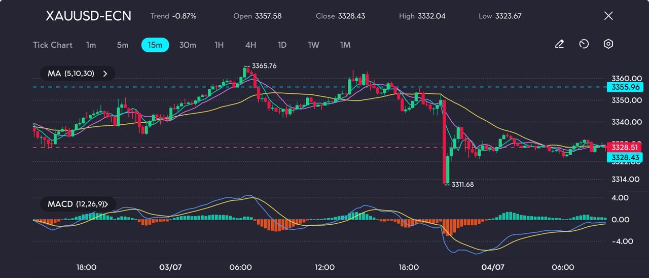 Gold (XAU/USD) experienced a steep intraday drop, plunging from 3365.76 to a low of 3311.68 before stabilising around 3328.43. The earlier bullish structure has broken down, with price now trading below the 5, 10, and 30-period moving averages. The recovery from the day’s low was shallow, suggesting limited bullish conviction.