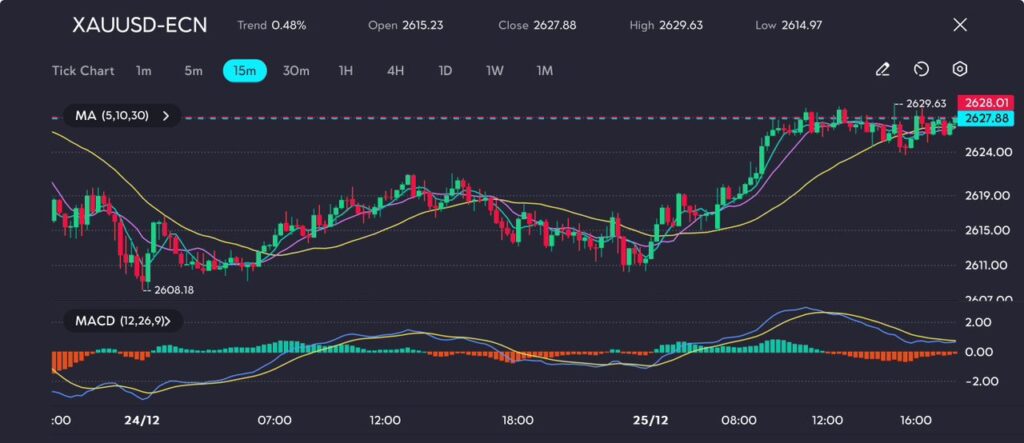 Picture: Gold (XAUUSD) hovers around 2628 after a short-term rally, with momentum easing into a holiday-thinned range, as seen on the VT Markets app.