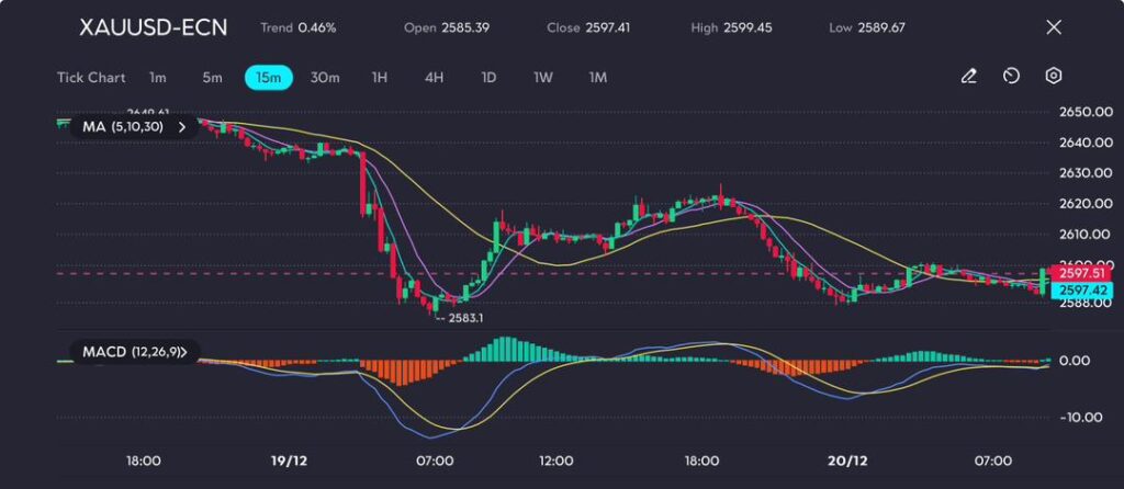The chart shows gold hovering near 2597 after a mild uptick from the 2583 region. Short-term moving averages flatten and converge near the current price, suggesting a pause in recent momentum. The MACD lines indicate the strong directional push seen earlier has cooled.