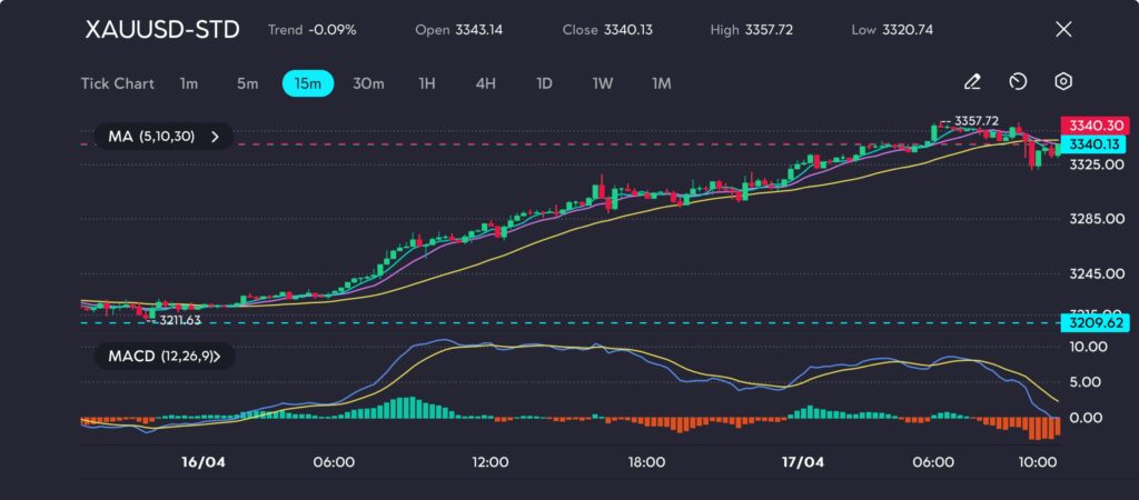 XAUUSD decreased by 0.09%, closing at 3340.13 after opening at 3343.14. The pair saw a steady rise earlier, reaching a high of 3357.72 before retracing slightly and closing near 3340.13.
