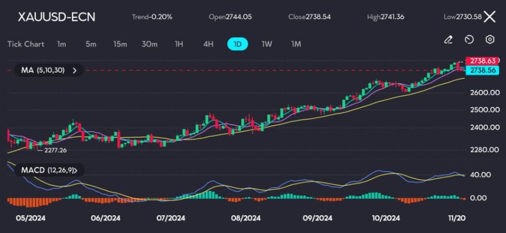 See: Gold (XAU/USD) is in a strong uptrend, reaching near 2738.56 with bullish momentum supported by a rising MACD, indicating sustained upward movement on the VT Markets app.